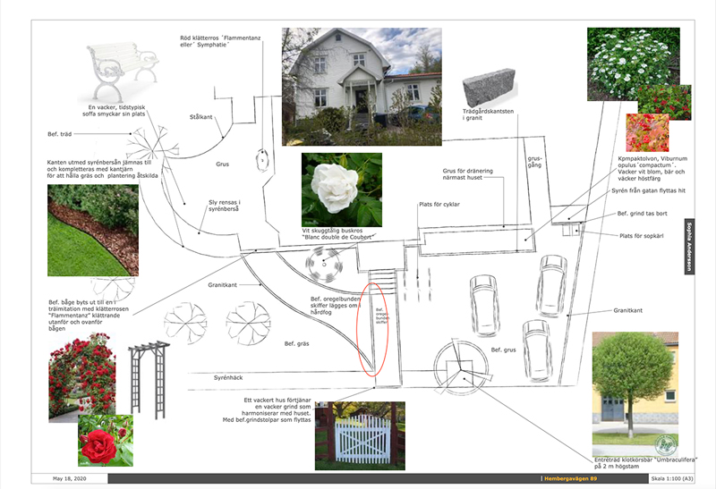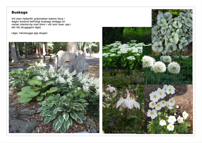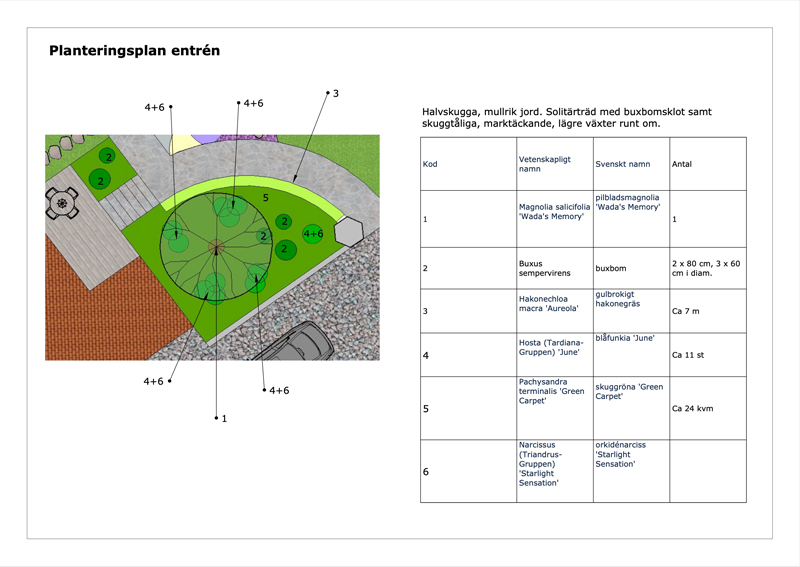 4. Växt- och materialval – Alla valda växter och övriga materialval specificeras och beskrivs i detalj med text och foto.