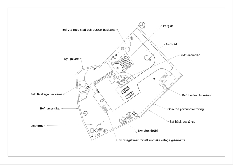 1. Konsultation: Vi träffas under 1-2 h och diskuterar era idéer, behov och visioner för trädgården. Vad tycker ni om i er nuvarande trädgård och vad vill ni förändra?